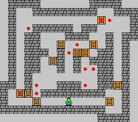 关卡为正方形,犹如驶向智慧之岸的一叶方舟。仅20见方的小舟,被分隔成4个独立小间,其中仅有一个小间的15只木箱不在点位。小房间之间界限清晰,结构分明。这种简洁明了的结构,或许是多数推箱子爱好者所喜爱的。